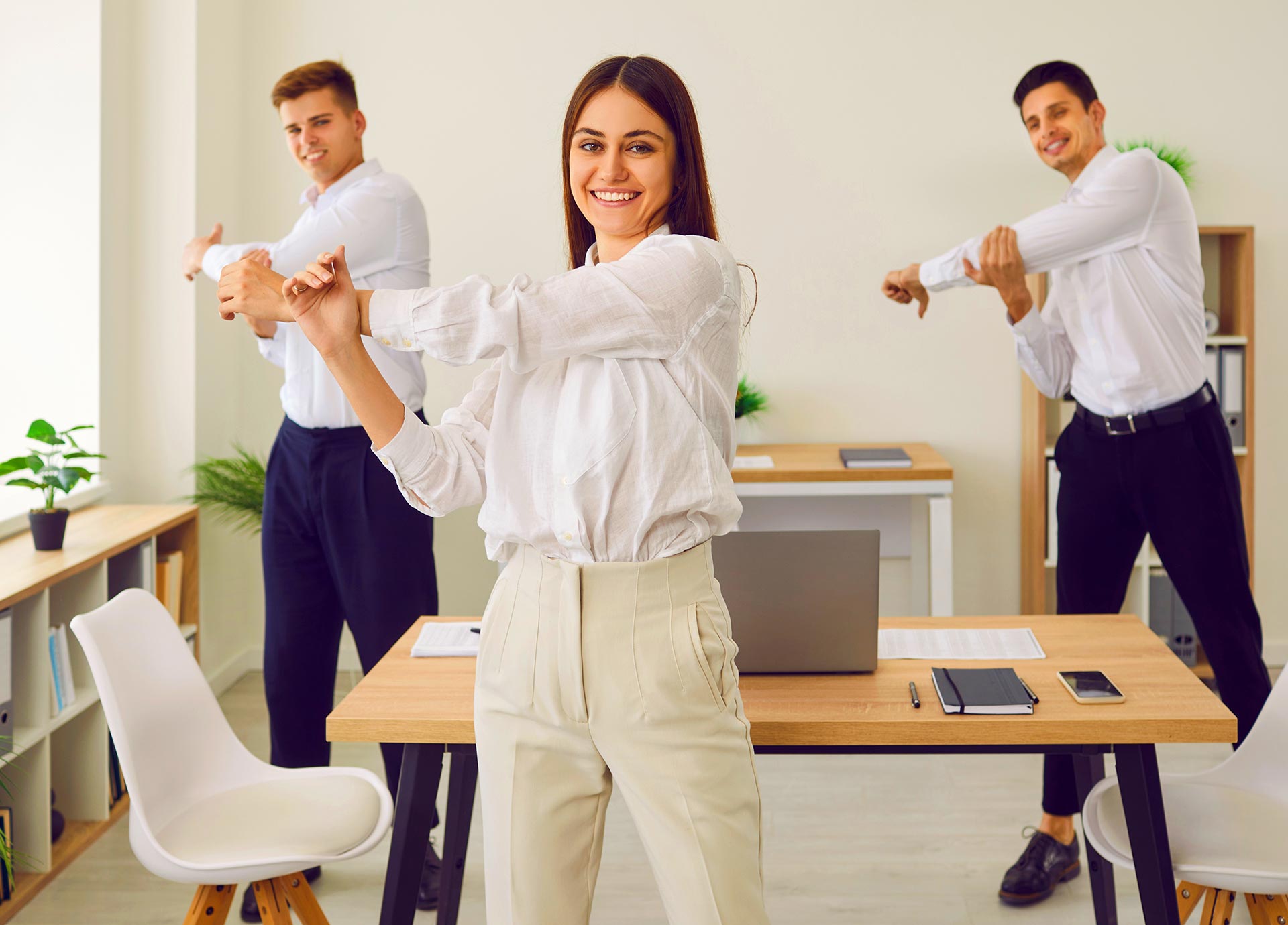 Schalten Sie am Arbeitsplatz regelmässig Bewegungspausen ein. Es genügen jeweils 5 Minuten, um Muskeln und Gelenke zu lockern, Verspannungen vorzubeugen und die Leistungsfähigkeit zu steigern.